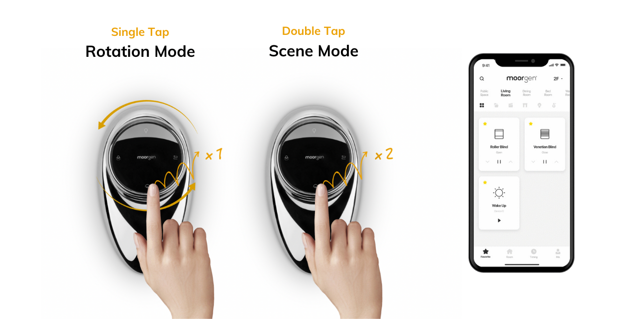 Preset scenes for your preferred environment, including light and sound, can be triggered by a double-tap. These scenes can be customized in the Moorgen mobile app.