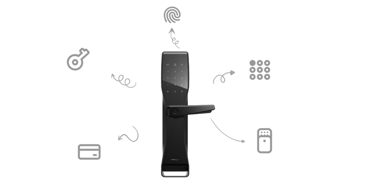 The Moorgen Smart Door Lock - T2 Series features five unlocking mechanisms: fingerprint, pin codes, smart card, mobile app, and physical key.