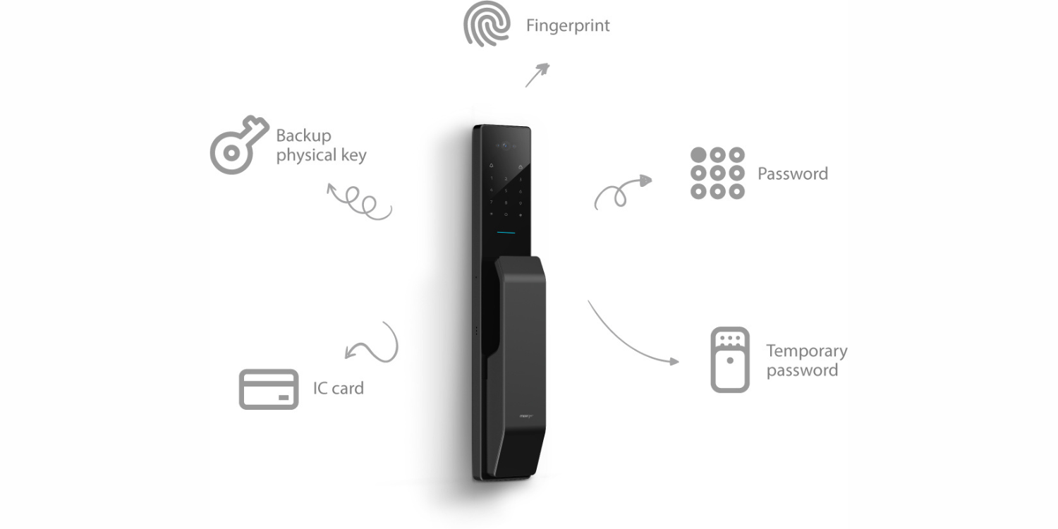 Moorgen Smart Door Lock - T3 Series มี กลไกการปลดล็อคห้าแบบ ได้แก่ แสกนลายนิ้วมือ รหัสพิน สมาร์ทการ์ด แอพมือถือ และกุญแจ